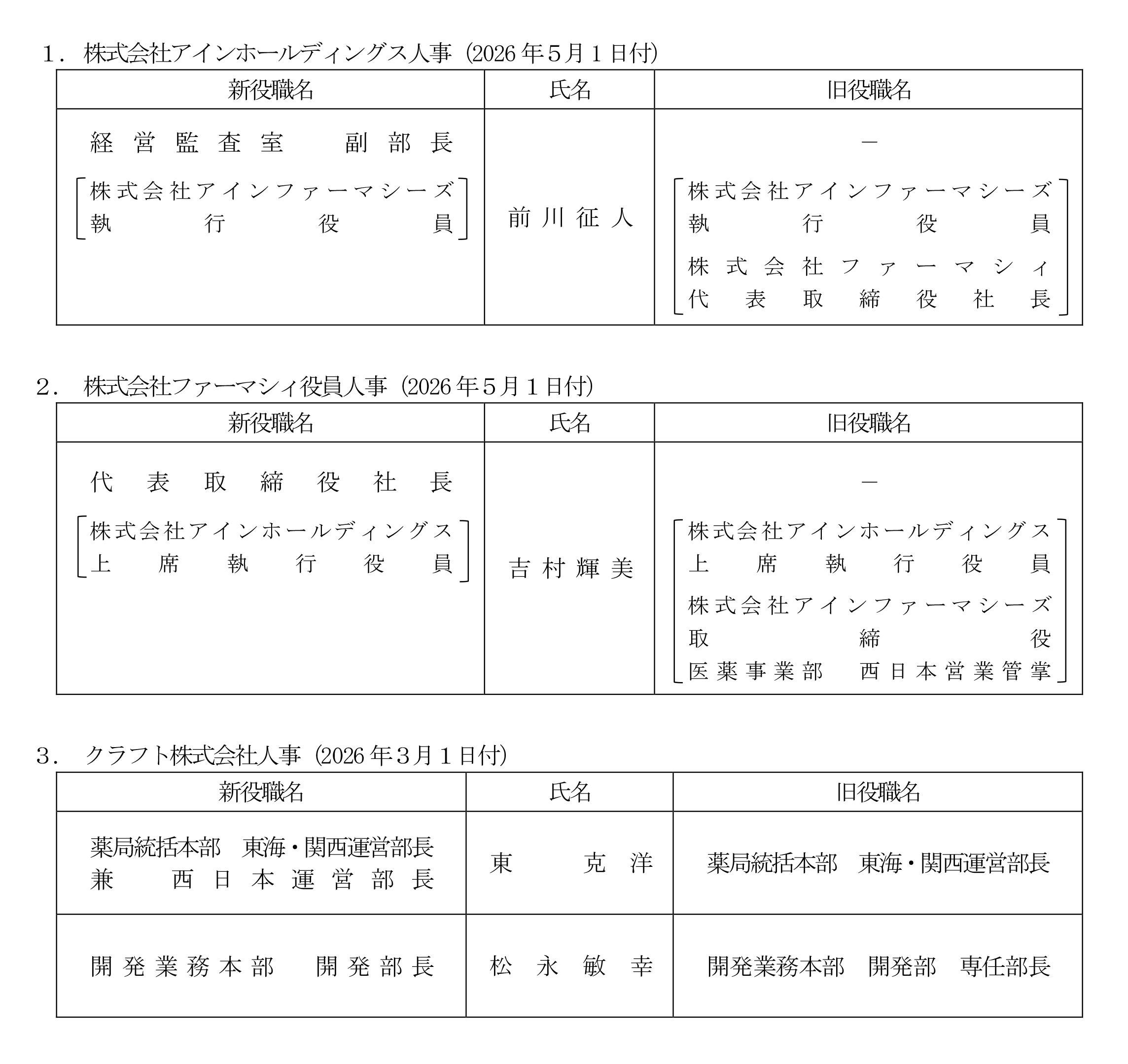 Catch! Breaking News アインホールディングス、人事異動に関するお知らせ 株式会社アインホールディングス 2026年02月27日 ツイート 当社グループにおいて、下記のとおり人事異動を実施することを決定いたしましたのでお知らせいたします。 記 以上