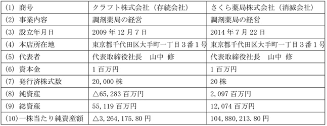さくら薬局を消滅会社とし、クラフトを存続会社とする吸収合併です。