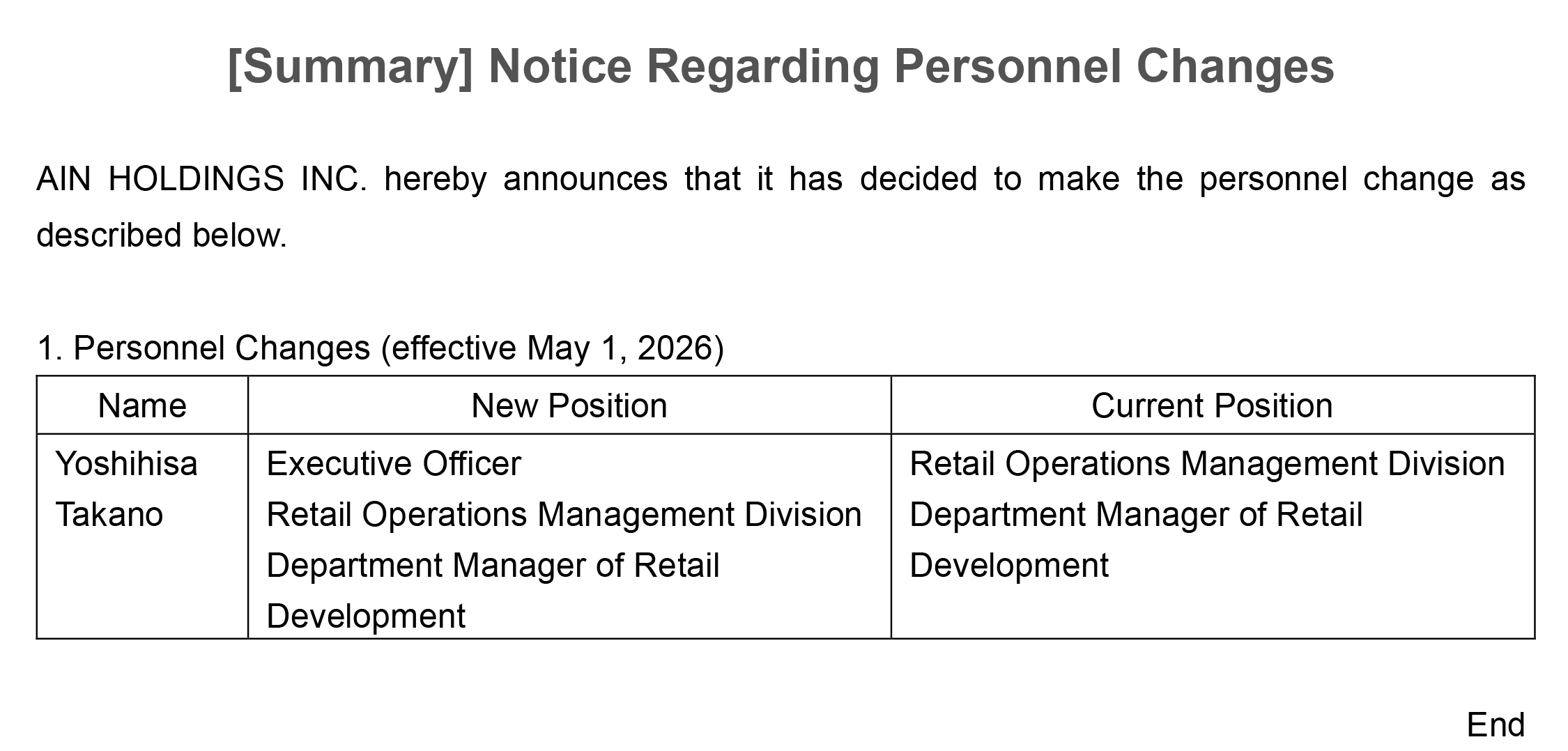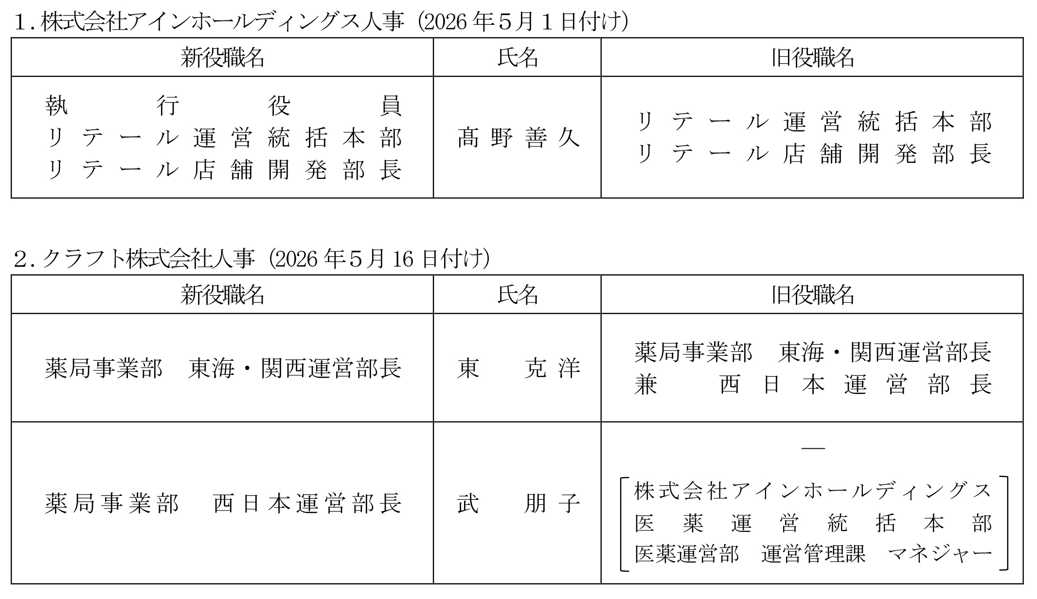 Catch! Breaking News アインホールディングス、人事異動に関するお知らせ 株式会社アインホールディングス 2026年04月28日 ツイート 当社グループにおいて、下記のとおり人事異動を実施することを決定いたしましたのでお知らせいたします。 以上