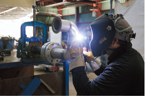 入社後は、約1カ月間の研修からスタート。配管加工の基本や部品製造などを覚えていく。研修修了後は、先輩社員と一緒に実際に工事現場へ入る。実戦的な技術と知識を積むと同時に、並行して必須となる資格の取得も目指す。
