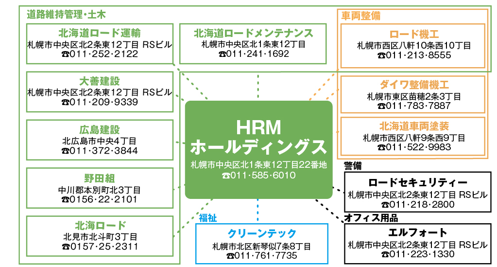 「HRMホールディングスグループ」(以下HRMHDG)は、筆頭事業会社で道路維持管理道内最大手の「北海道ロードメンテナンス」を中心に、土木、車両整備、警備、オフィス用品など多様な事業会社でグループを形成している。