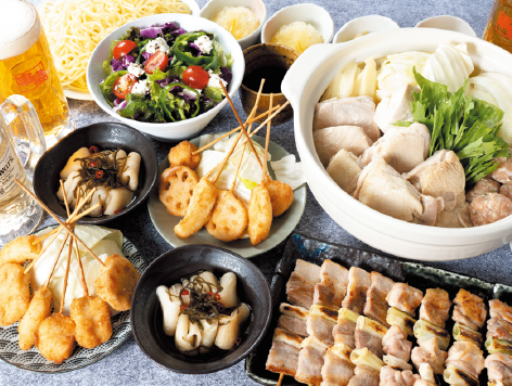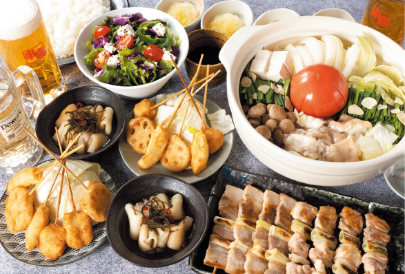 厳選素材を使った自慢の串焼きをはじめ、鍋料理や一品料理、揚げ物、サラダ、麺、ご飯もの、スイーツまで、多彩なメニューを取りそろえる「串鳥番外地」。