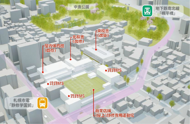 また、1800坪にのぼる静修学園エリアでは大型店舗と賃貸マンション3棟を開発するほか、札幌静修高等学校の本校舎改築工事も受注。27年春の竣工を予定している。