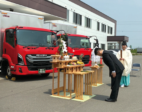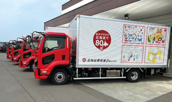 25年は創業80周年を記念して、北海道日本ハムファイターズ元選手の鶴岡慎也氏を招いた式典を開催したほか、運転手の子ども向けに絵画コンクールを開き、優秀8作品をトラックの荷台にラッピングした。