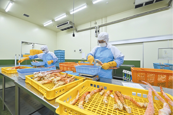 昨年度の売上高は約60億円。その大半をカニ関連製品が占め、年間取扱量は2000㌧に上る。道内でも有数のカニ専門商社として確かな存在感を示している。