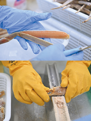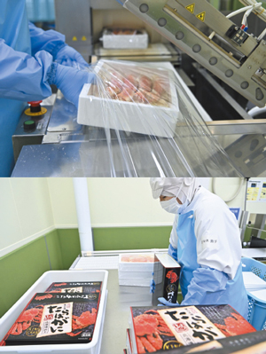 衛生・品質管理体制にも余念がない。工場内のトイレや手洗い場、ドア、シャッターには非接触型設備を採用。換気調整によって外部より気圧を高めた腸圧エリアを設け、異物混入対策を徹底するほか、品質管理室を設置し、専門機器によるカニ製品の自社検査体制を構築。食品安全マネジメント規格「JFS‐B」の認証も取得しており、外部機関からも高い評価を得ている。