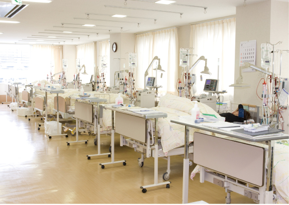 透析用ベッドは19床を完備し、外来透析と入院透析に対応。看護師と臨床工学技士が連携しながら治療にあたっているほか、日々の食事管理など生活指導も徹底して、合併症の発症を予防する質の高い透析治療を追求している。