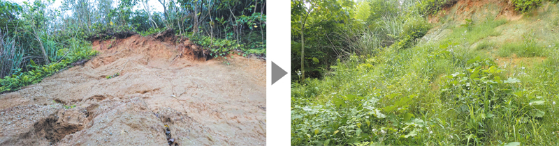 業務支援では、環境保全の一環として健康食品メーカー「日健総本社」(本社・岐阜県)、日本最大手の建設コンサルタント「日本工営」(本社・東京都千代田区)、「東京農業大学」と協業。共同開発した土壌侵食防止技術「BSC工法」の普及に努めている。