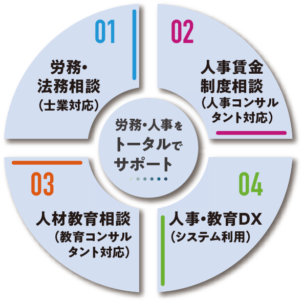 士業による「労務・法務相談」と人事コンサルタントの「人事賃金制度相談」、教育コンサルタントが提供する「人材教育相談」、同社の独自システムを活用した「人事・教育DX」がオールインワンとなっており、企業の労務・人事をトータルでサポート。異なる分野の専門家が集結することで、横断的な対応が可能となる。中小企業の弱点を補完できる優良サービスといえる。
