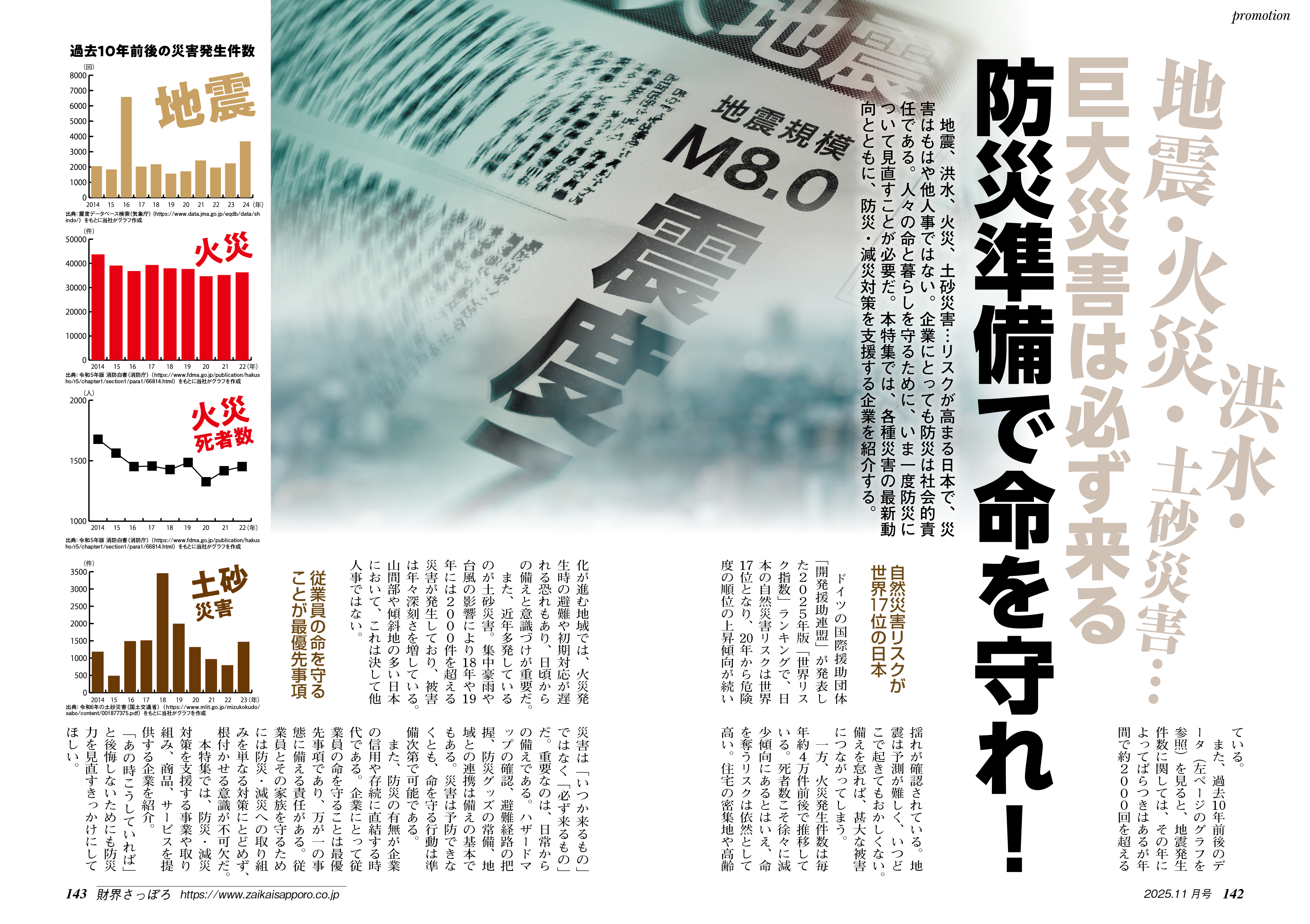 地震、洪水、火災、土砂災害…リスクが高まる日本で、災害はもはや他人事ではない。企業にとっても防災は社会的責任である。人々の命と暮らしを守るために、いま一度防災について見直すことが必要だ。本特集では、各種災害の最新動向とともに、防災・減災対策を支援する企業を紹介する。
