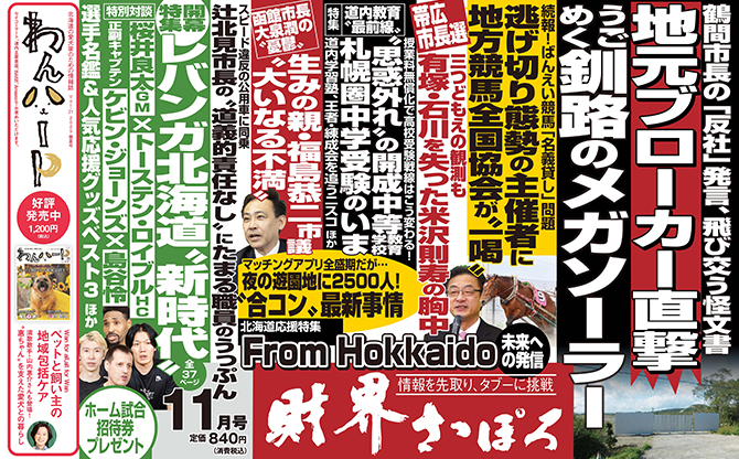 さらに今月は、道内各地方の注目記事も満載。先月号でスクープした、帯広競馬場開催「ばんえい競馬」での名義貸し問題は、本誌先月号発売と前後しての“奇妙な動き”に注目。ばんえい主催者の帯広市が「名義貸しは問題なしの報告書を出す」との話が水面下で流れた一方、その後の市議会では市が「まだ調査中」として報告書などは出されなかったもの。実は、ばんえいをはじめ地方競馬の開催に協力する「地方競馬全国協会」が徹底調査をするよう“指示”していたといいます。本誌締め切り直前に入ってきた新展開を含め注目の内容です。