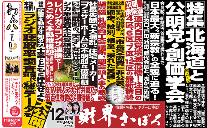 ともあれ斉藤代表や西田実仁幹事長は、この間精力的にメディアへ露出して発信するなど、これまでになく公明、そして支持母体である創価学会に対する注目が高まっていることも事実。今月のトップ特集「北海道と公明党・創価学会」では、道内の創価学会の全貌を明らかにするとともに、20万人とも30万人ともいわれる信者を要したその選挙活動や「永遠の師匠」と呼ばれる初代~三代の会長と道内の浅からぬ縁など「知っているようで知らない」公明・学会の全てを網羅しました。