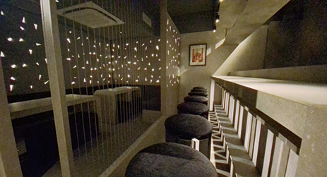 落ち着いた店内は、森の中にある石造りの家をイメージした設計。カウンター席の間をひもで作ったカーテンで区切ることにより、プライバシーを守りつつ〝木漏れ日〟のような暖かさも感じられる。