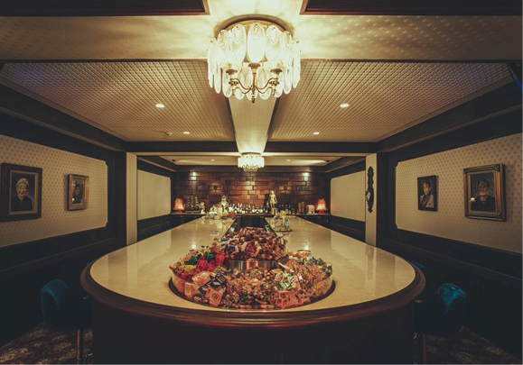 地下へと続く階段を下り重厚な扉を開けると、そこに広がるのはまるで昭和の世界。懐かしい歌謡曲が時折流れ、薄暗い照明に照らされたU字型のカウンターがゆったりと曲線を描く。妖艶な雰囲気をまとう女性スタッフの姿も相まって、ノスタルジックな気持ちになる。