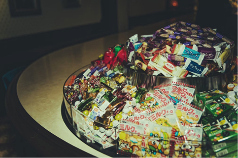 山積みされた駄菓子は食べ放題だ