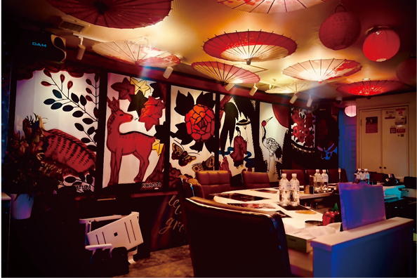 店内は花魁をテーマに、高級感漂うゴージャスな雰囲気で居心地抜群のカウンター8席、ボックス12席を用意。最新のカラオケシステム「LIVEDAM WAO」は、テクニックだけでなく表現力まで理解できる「精密採点」機能まで付いており、歌に自信がある人には是非おすすめしたい。